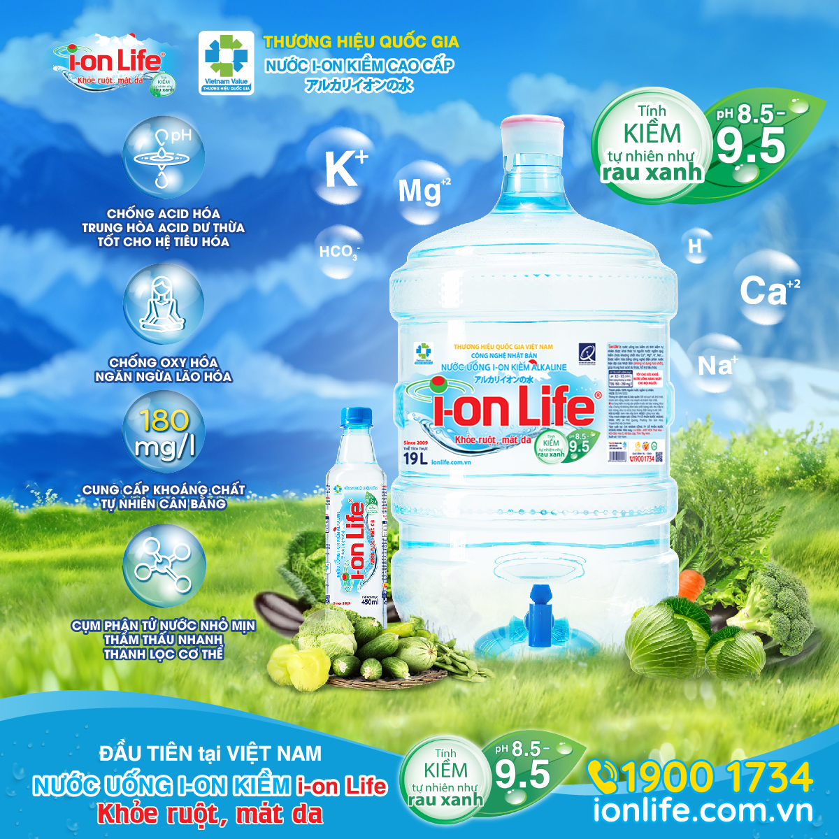 Được sản xuất bằng công nghệ điện phân nước tiên tiến từ Nhật Bản nên nước i-on Life có cấu trúc phân tử nhỏ mịn (nhỏ hơn nhiều lần) so với nước uống thông thường khác giúp bù nước nhanh chóng, thanh lọc cơ thể. i-on Life khai thác từ mạch nước ngầm quý nên giàu khoáng chất tự nhiên phong phú như: Na, Ca, K, Mg… tồn tại dưới dạng ion cơ thể dễ dàng hấp thu, giúp tăng sức đề kháng khi sử dụng thường xuyên.
