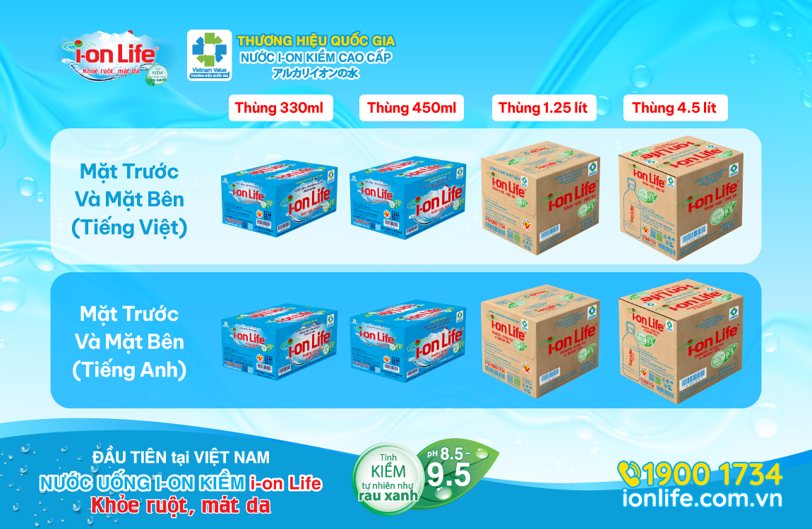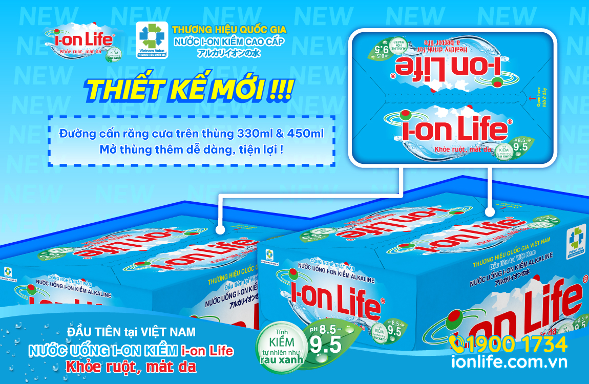 Thực hiện thiết kế đồng bộ hệ thống thùng sản phẩm i-on Life 330ml, 450ml, 1.25L và 4.5L với việc bổ sung logo “Hàng Việt Nam Chất lượng cao do Người tiêu dùng bình chọn”, nhằm tăng cường nhận diện thương hiệu và củng cố niềm tin về chất lượng sản phẩm đối với người tiêu dùng.