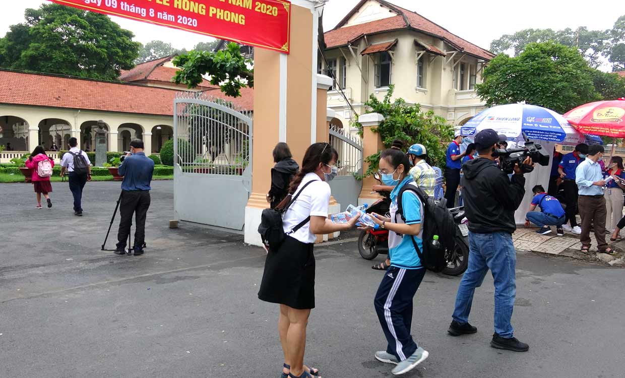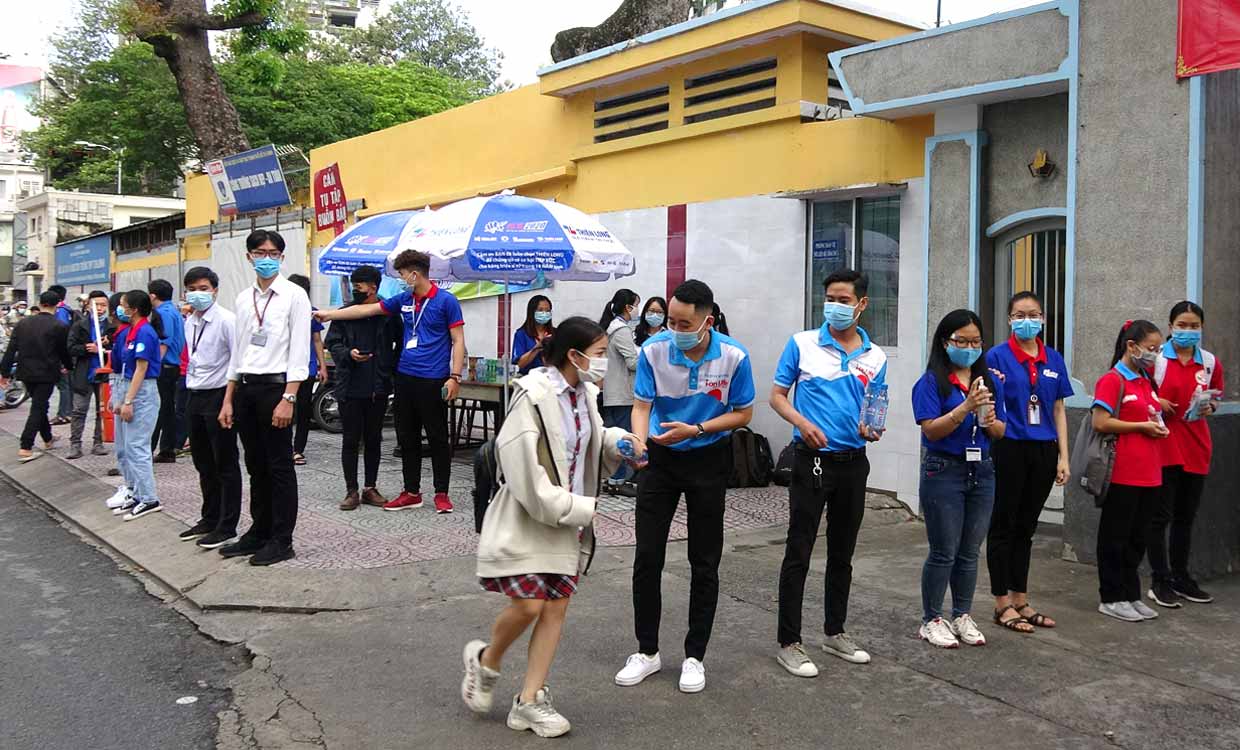 Tình nguyện viên của i-on Life tặng nước cho thí sinh